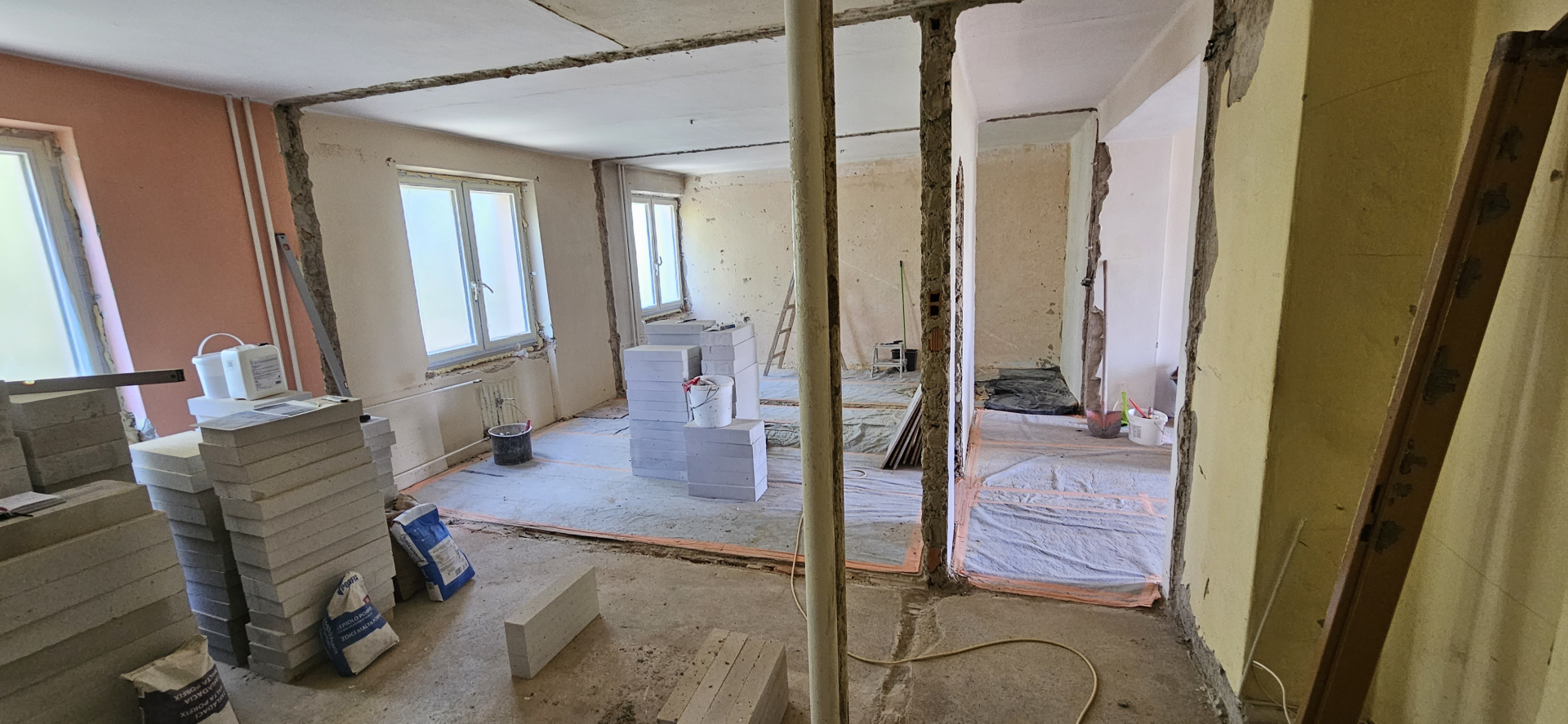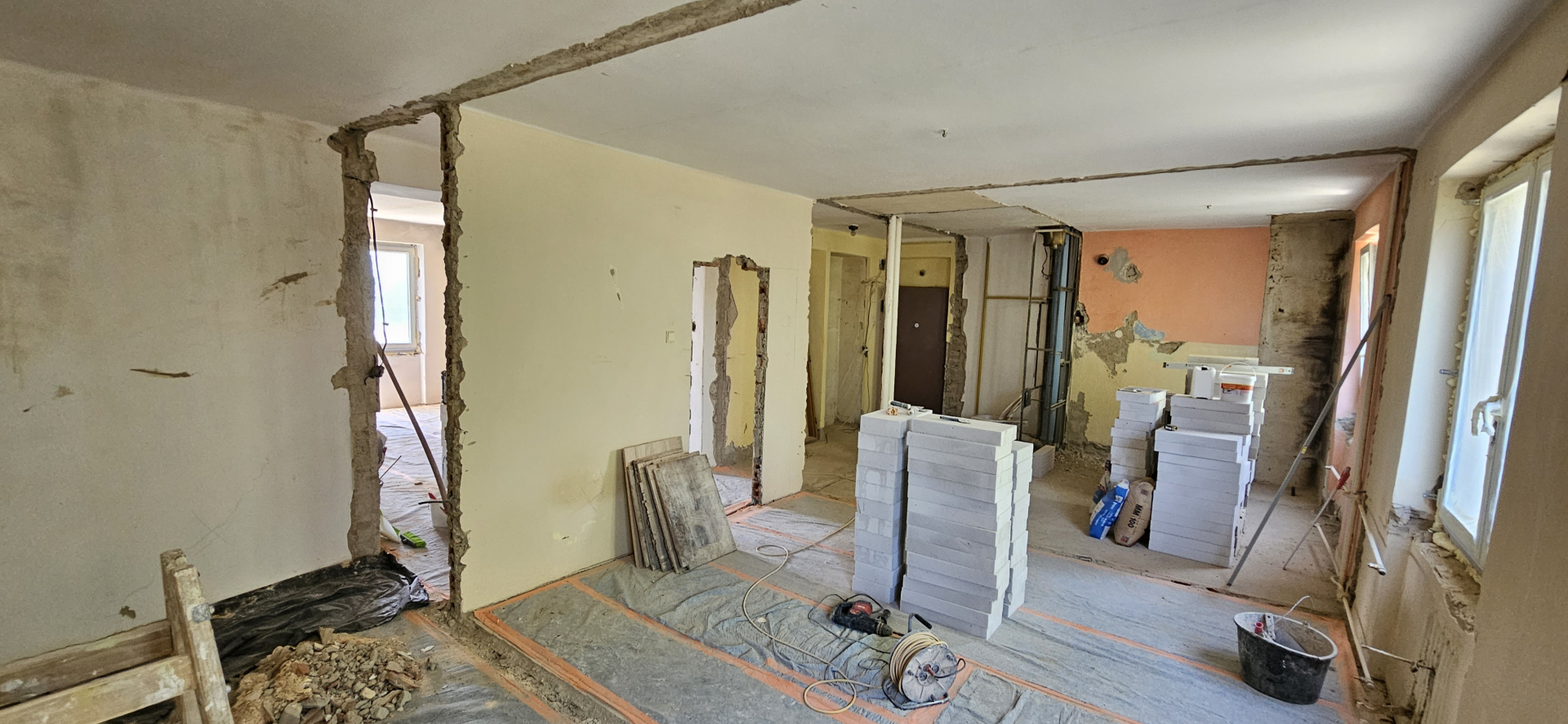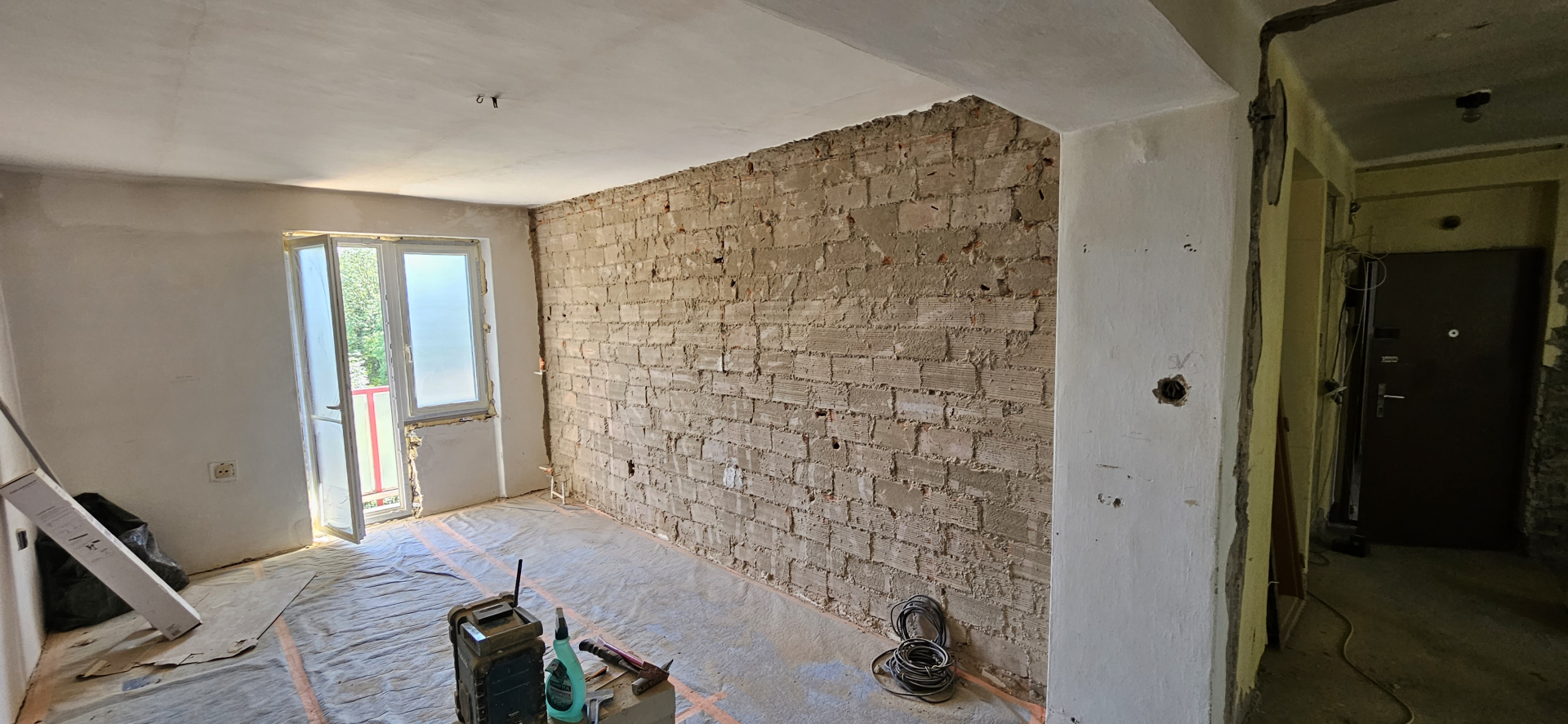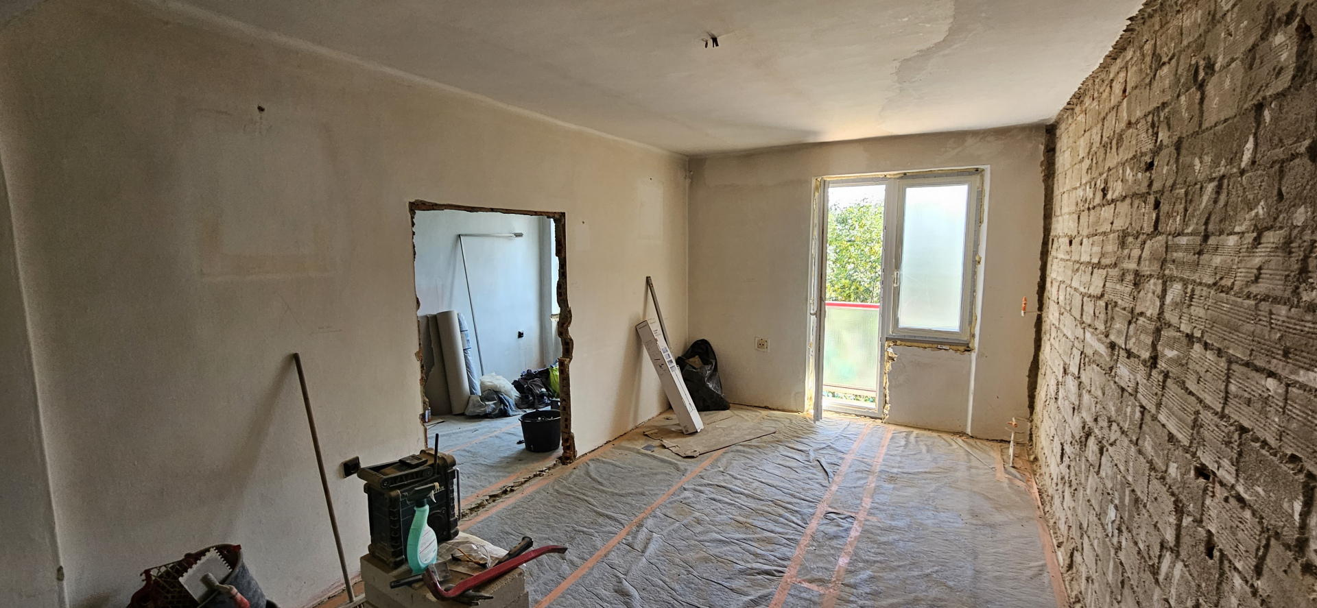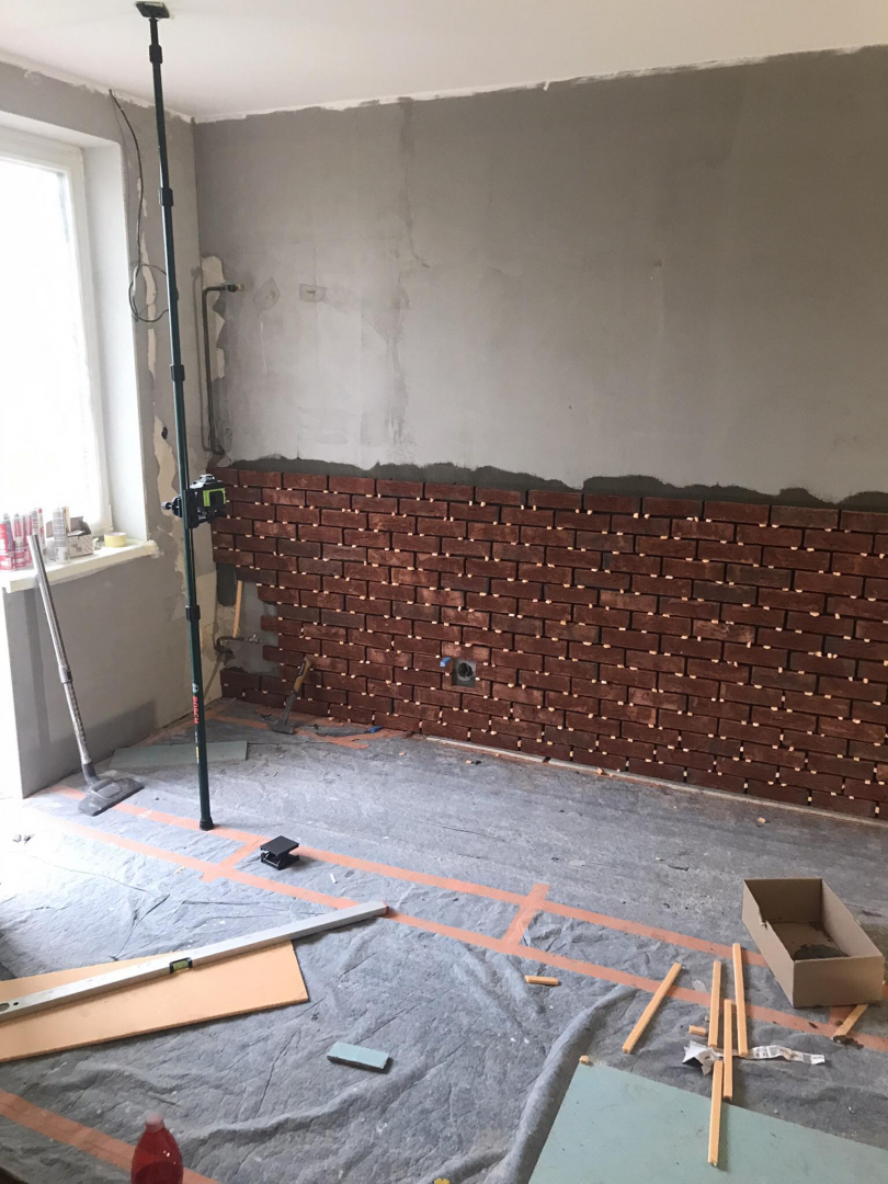Rekonštrukcia bytu na Vodárenskej ulici v Košiciach.Pri tejto rekonštrukcii sa menila dispozícia bytu a realizovlali sme dekoračný "tehlový" obklad steny. Všetky Priebeh rekonštrukcie